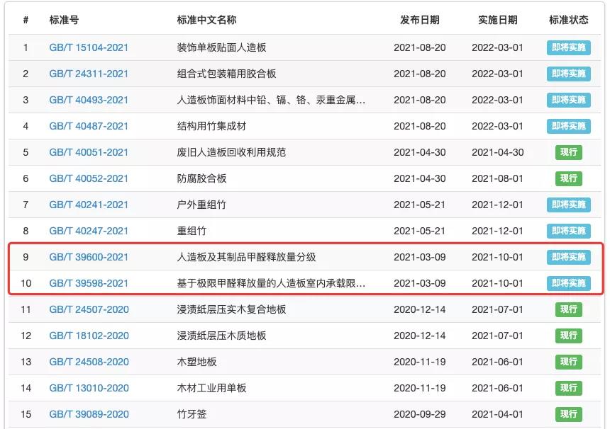 GB/T 39600—2021《人造板及其制品甲醛釋放量分級》,2021年3月9日發布,2021年10月1日實施。